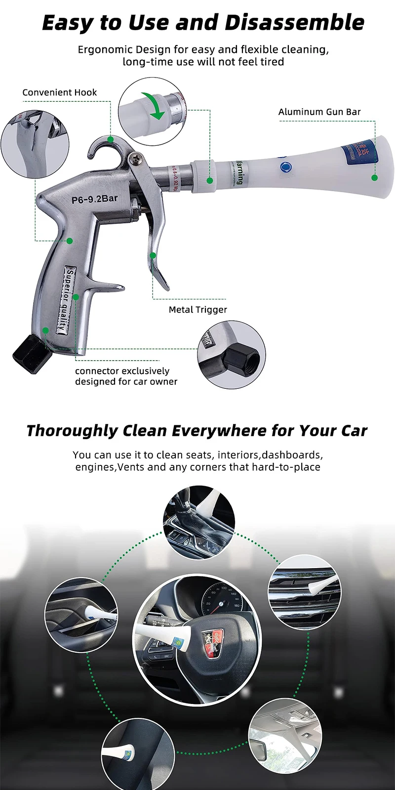 High Quality: Aluminum alloy gun bar and sprayer nozzle, a more durable and efficient car duster interior and exterior surface/detail cleaning. The key connectors and ball valves are made of copper, and the extraordinary quality you deserve.