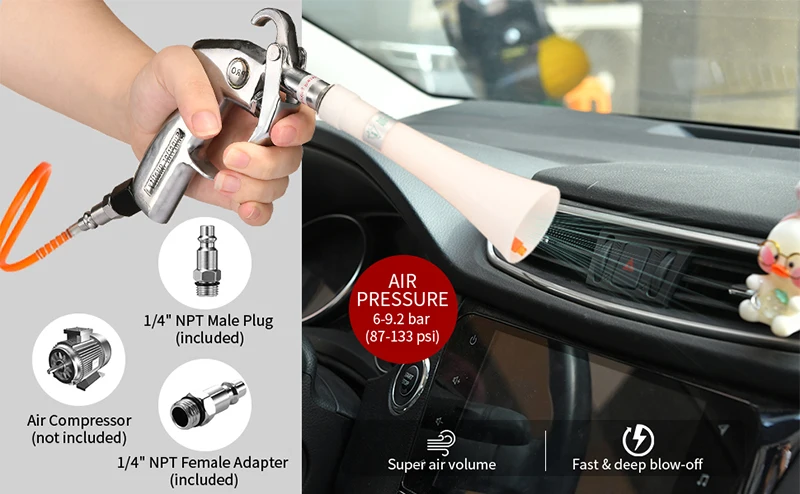 Air Pressure: 0.6-0.92Mpa/87-133 psi; For optimal performance ,Car Cleaning Air Gun requires an air compressor producing 5 CFM or more at 90 psi.
