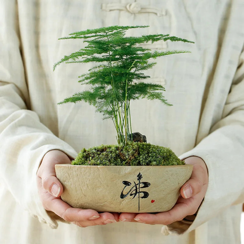 Home Garden Round Glazed Ceramic Beige-Green Color Black Chinese Writing Design Non-Porous Perforated Desktop Flower Pots