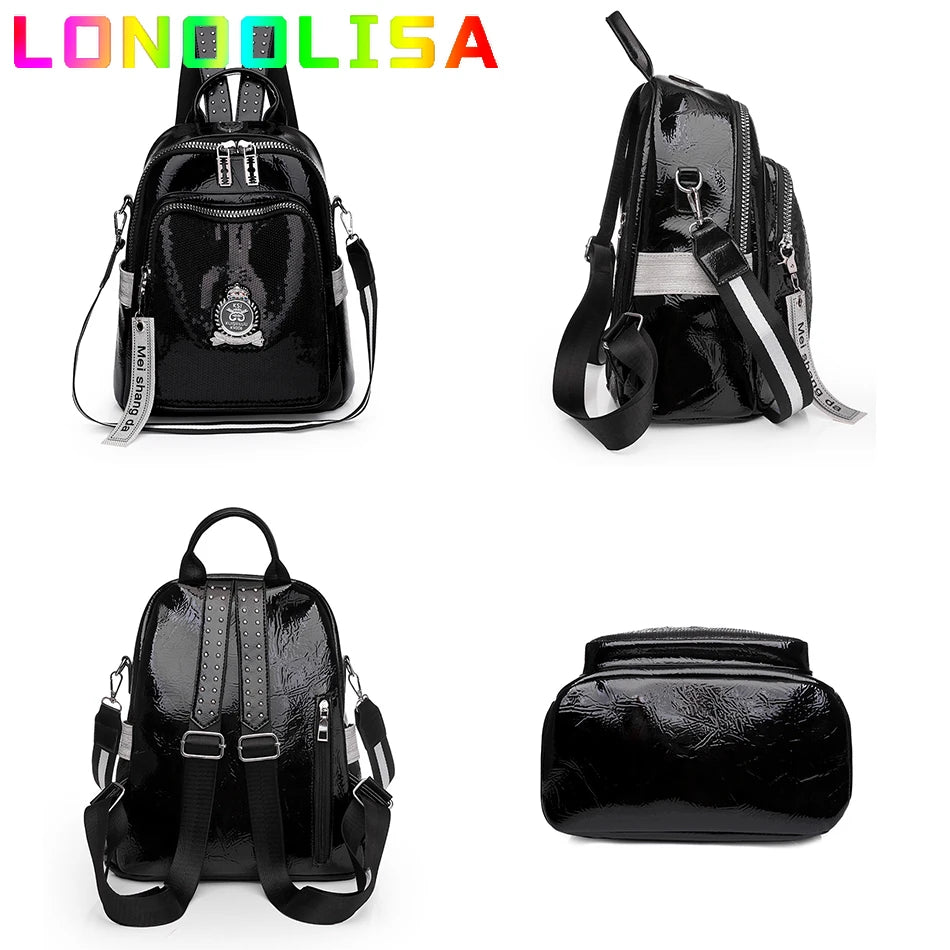 LONOOLISA Women Large Black-White Faux Leather Letter Sequins Logo On Front Design Built-In Laptop Compartment Polyester Lining Shoulder Straps-Handle External Pockets Double Zippers Backpacks/Interior Slit Pocket/Interior Zipper Pocket