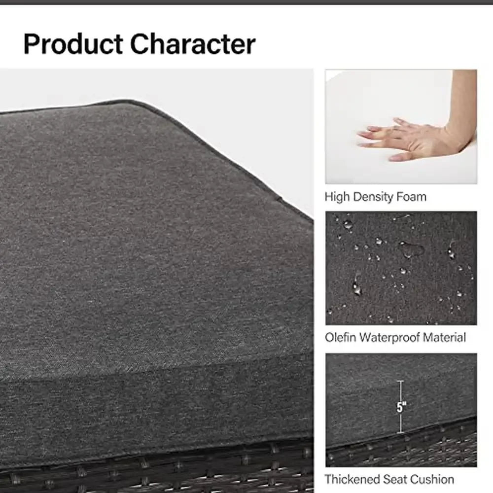 This outdoor patio furniture is made of Olefin fabric that is water-resistant and has good anti-aging performance, improving the service life of the sofa. The high-density sandwich sponge pad has good elasticity. The seat cushion is widened and thickened and can reach 5", bringing you unparalleled comfort.