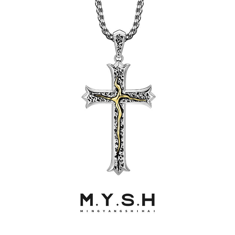 MYSH Adult Men Fine Imitation Brass-Sterling Silver-Gold-Plated Metal Garden Of Eden Tree of Life Multi-Layer Black-White Gold Inlaid Cracked Cross Pendant Chain Necklaces