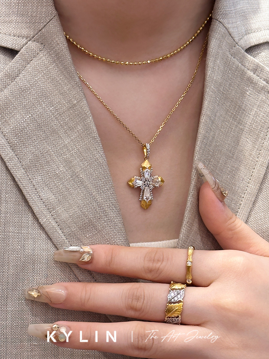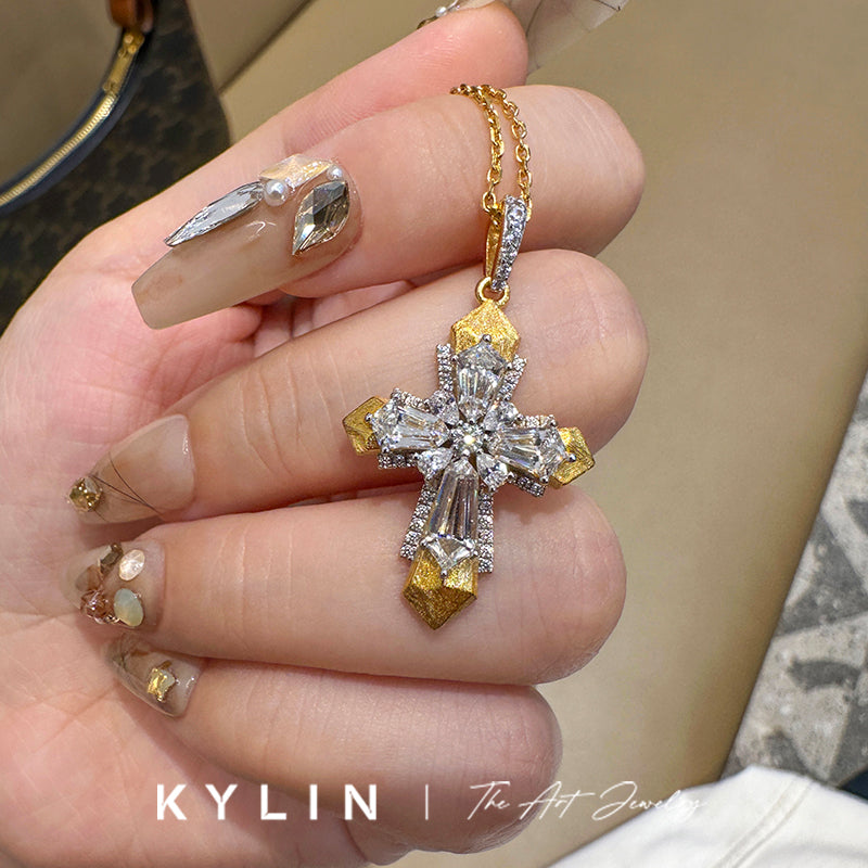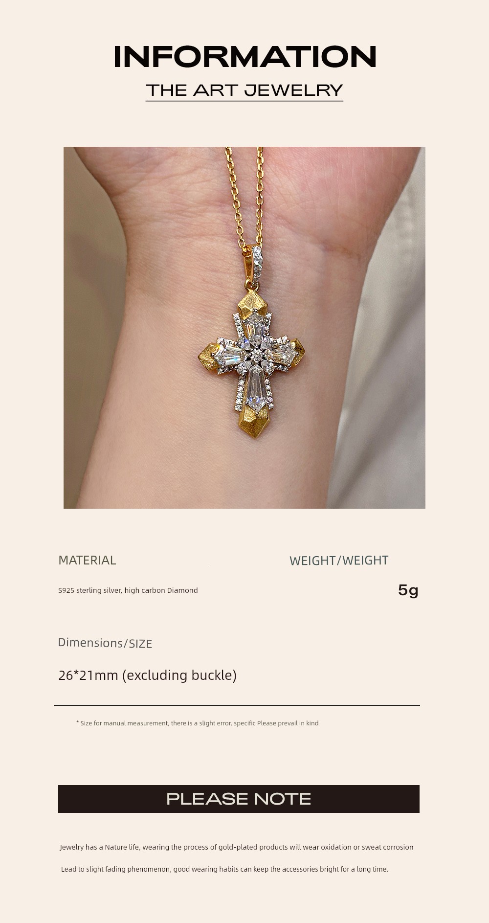 QIXUAN Adult Unisex Fine Imitation Sterling Silver-Gold-Plated Metal Inlaid Artificial Clear White Shiny Diamond-Like Gemstones Cross Pendant Clavicle Chain Necklaces